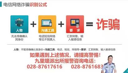 在最后介绍“识别防范网络诈骗”这部分内容时,赵警官向大家再次展示了电信网络诈骗的“识别公式”,不论诈骗形式、方法如何,都要牢记诈骗的三个特征:不确定的人物、不见人的沟通、最终目的是套路钱财。面对这样的情况,要坚持“三不一多的原则”,未知链接不点击,个人信息不透露,陌生来电不轻信,转账汇款多核实,多看、多听、多问。最后,赵警官呼吁同学们及时下载好国家反诈中心APP以及关注蓉城反诈卫士微信公众号,在学习的空闲时间学习相关知识,做好自己的防诈骗卫士。