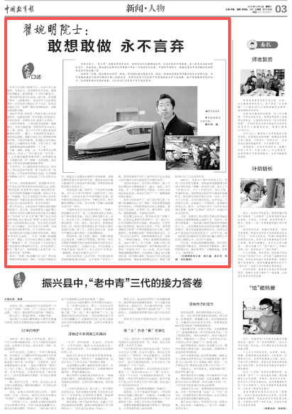 12月2日,《中国教育报》刊发题为《翟婉明院士:敢想敢做 永不言弃》的专访文章。报道以第一人称口吻,回顾了中国科学院院士、西南交通大学首席教授翟婉明求学、科研故事。他以数十年如一日的坚守与突破,首创“车辆—轨道耦合动力学”理论,带领团队建立高速列车—轨道—桥梁动力相互作用理论及安全评估方法,为中国高铁速度不断提升提供了核心理论支撑。诚如翟婉明院士所言:“中国高铁的辉煌成就,来自我们对理想的不懈追求、对科技的不断探索。愿年轻的朋友们,既仰望星空,又脚踏实地,筑梦于心,逐梦前行。”原文如下: